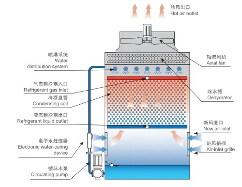 An evaporative condenser is a highly efficient, energy-saving heat exchange device that uses a water film sprayed on the outer surface of the heat exchange coil to evaporate and absorb heat from the fluid inside the tube. This process facilitates the condensation of the internal fluid. Dry, cool air enters from the lower air inlet, undergoing heat and mass exchange with circulating water flowing down from the top. The cooled medium enters from the upper inlet of the coil group, undergoing multiple heat exchange cycles with the circulating water before being discharged from the lower outlet of the coil group.